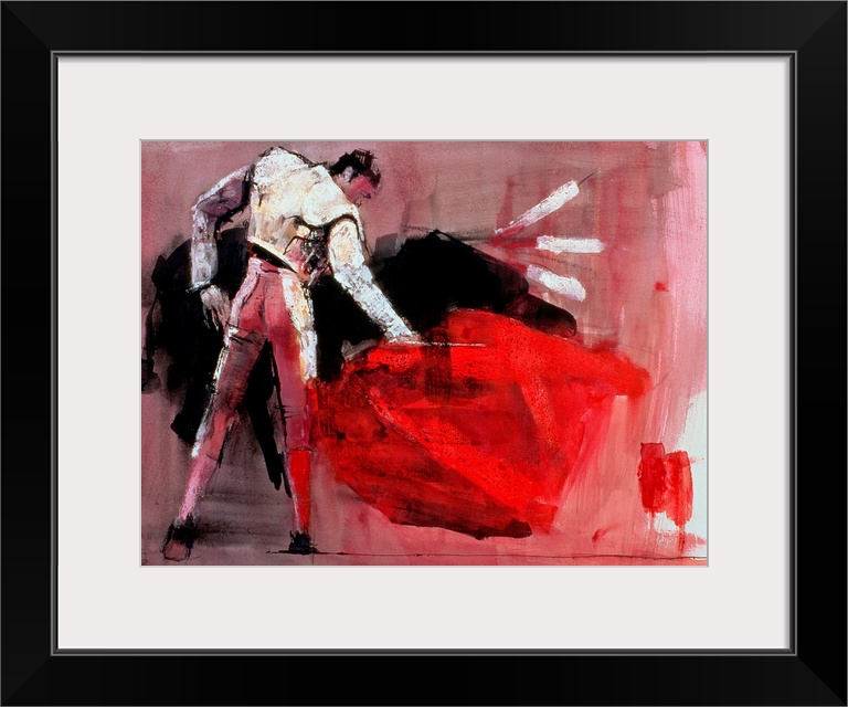 <p>Large contemporary art shows a finely dressed man with a brightly colored cape tempting a bull to charge him. Located on the bull's back, the matador has inserted three spears while the bull charged him.</p>