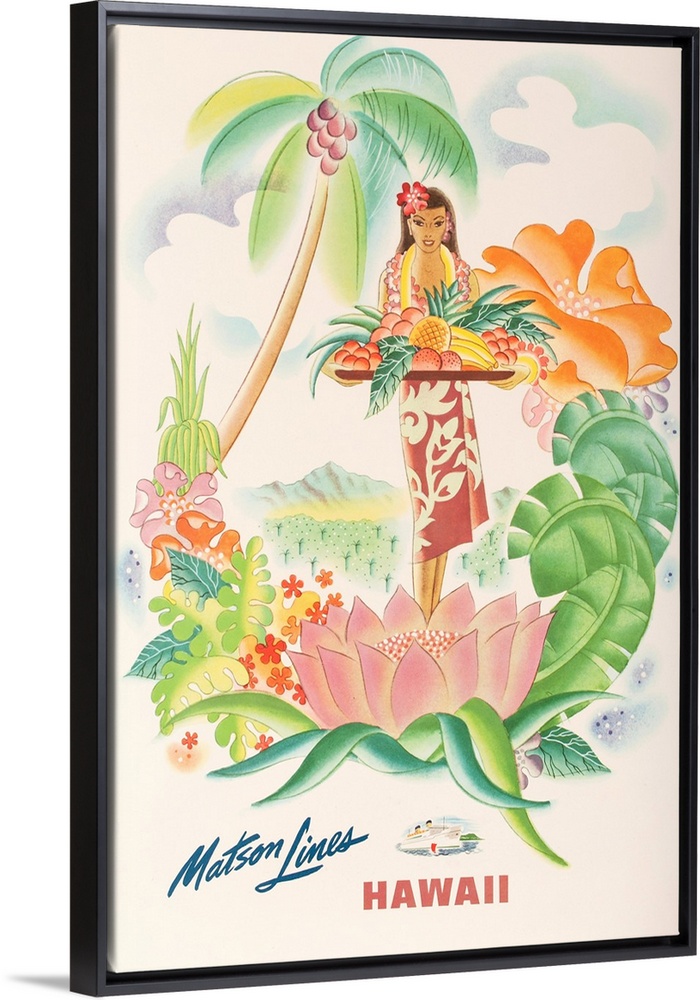 <p>ca 1950's Native Hawaiian beauty in saong and lei ofers a bounty of tropical fruits in a flower filled paradise.</p>