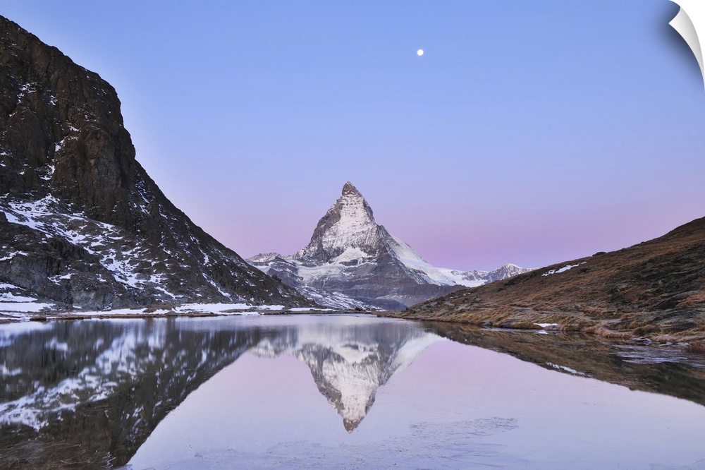 <p>Matterhorn reflected in Lake Riffelsee at Dawn with Moon, Zermatt, Alps, Valais, Switzerland</p>