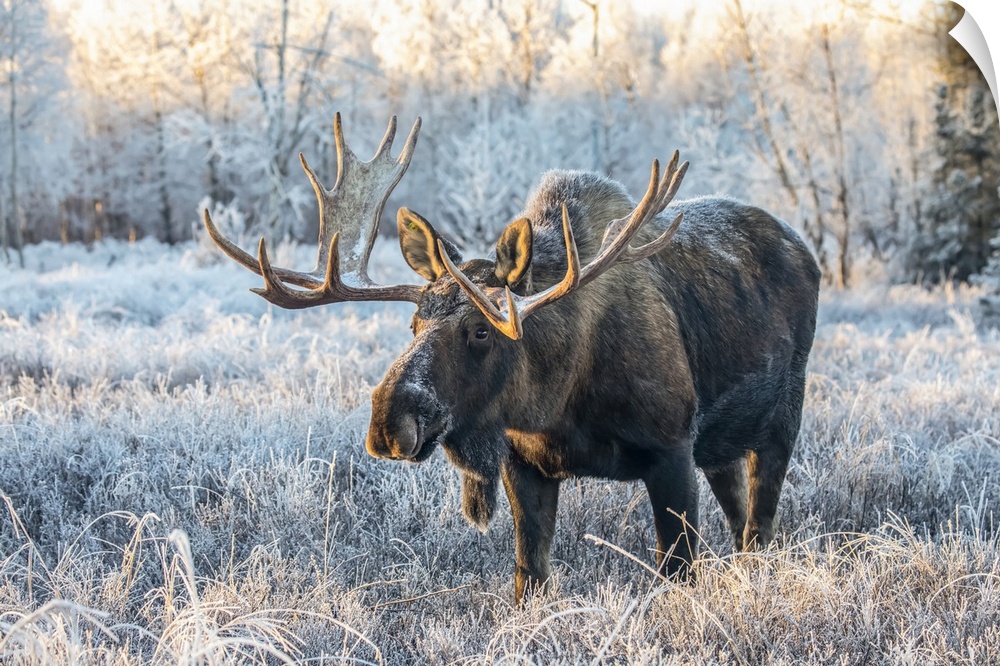 <p>Mature bull moose (Alces alces) standing and feeding in early morning with hoar frost in in the field, South Anchorage, South-central Alaska; Alaska, United States of America</p>