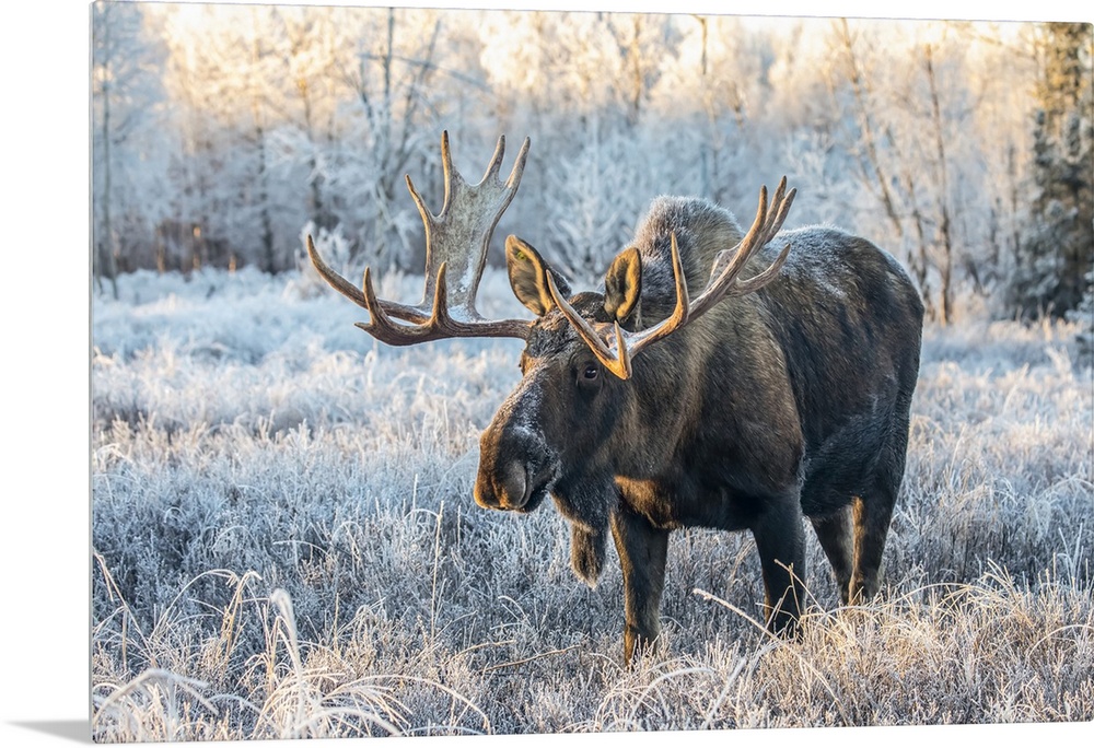 <p>Mature bull moose (Alces alces) standing and feeding in early morning with hoar frost in in the field, South Anchorage, South-central Alaska; Alaska, United States of America</p>