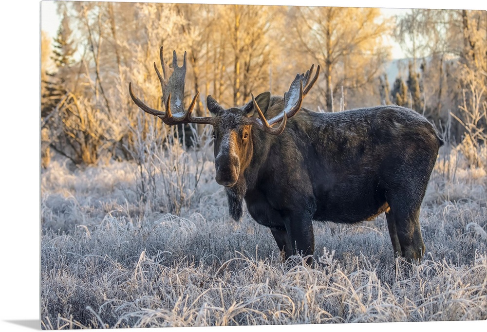 <p>Mature bull moose (alces alces) standing and feeding in early morning with hoar frost in in the field, south anchorage, south-central Alaska, Alaska, united states of America.</p>