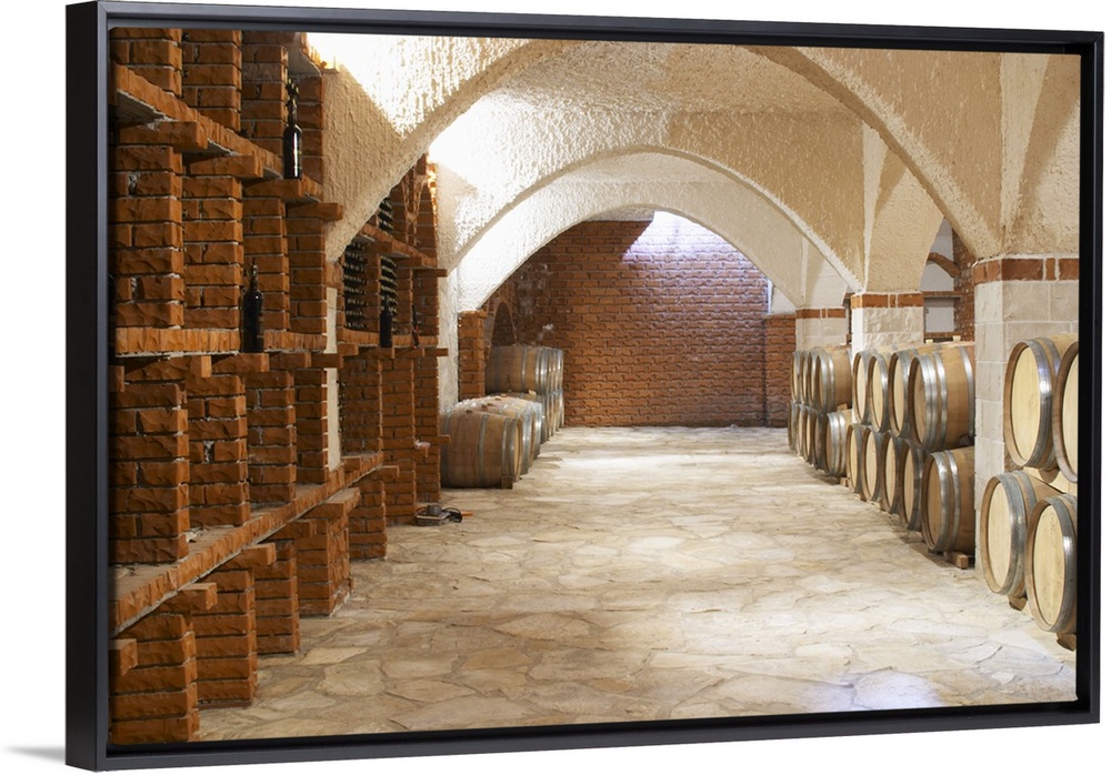 <p>Wine cellar with bottle bins and oak barrels, arched vaulted ceiling. Matusko Winery. Potmje village, Dingac wine region, Peljesac peninsula. Matusko Winery. Dingac village and region. Peljesac peninsula. Dalmatian Coast, Croatia, Europe.</p>