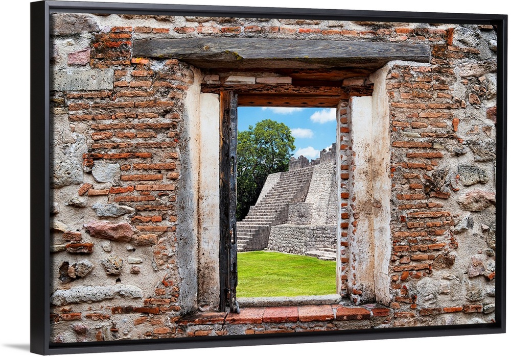 <p>View of a Mayan Pyramid framed through a stony, brick window. From the Viva Mexico Window View.</p>