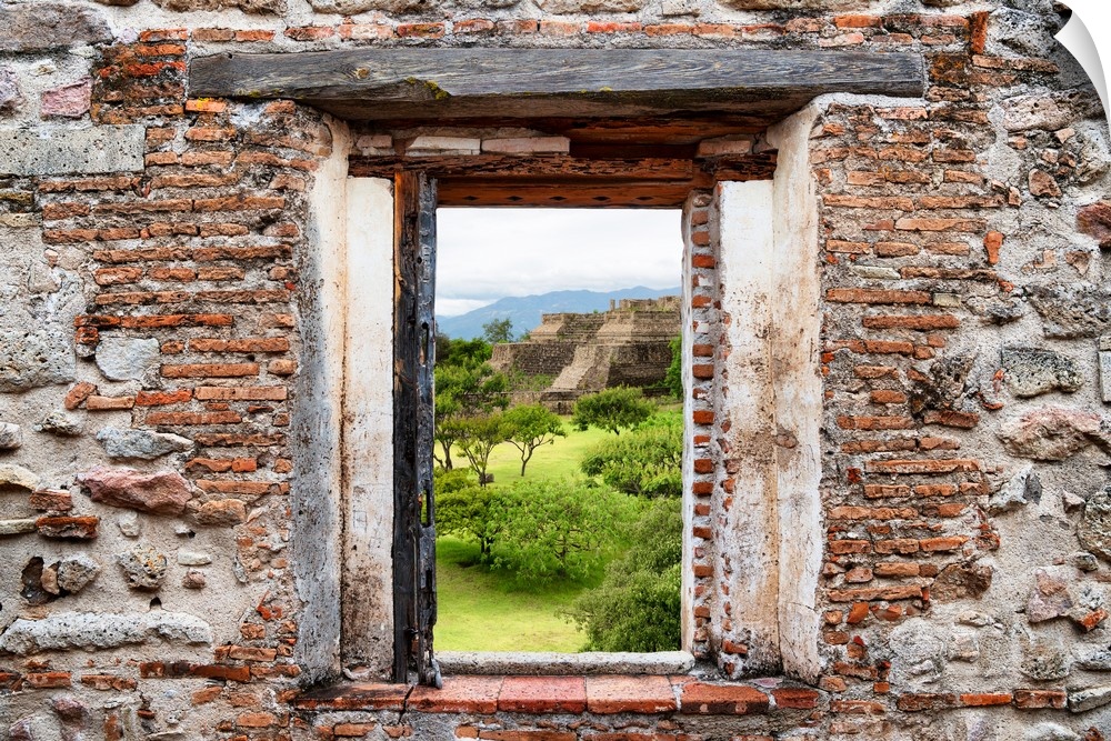 <p>View of the Mayan Temple of Monte Alban framed through a stony, brick window. From the Viva Mexico Window View.</p>