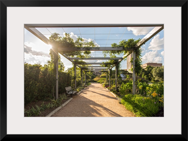 <p>Dirt path lined with beautiful plants and flowers under a pergola in McGovern Centennial Gardens at Hermann Park in Houston.</p>