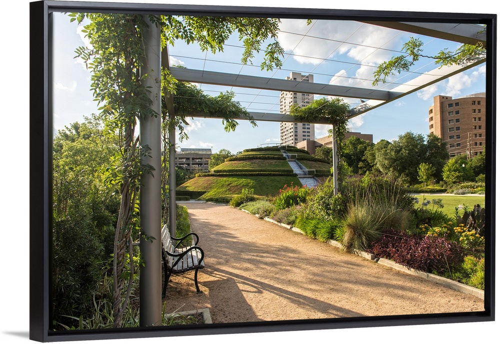 <p>Dirt path lined with beautiful plants and flowers under a pergola in McGovern Centennial Gardens at Hermann Park in Houston with the waterfall in the background.</p>