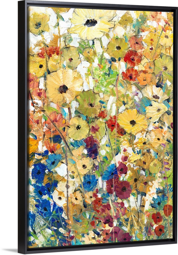 <p>Contemporary artwork of a cheerful field of rainbow colored flowers in full bloom.</p>