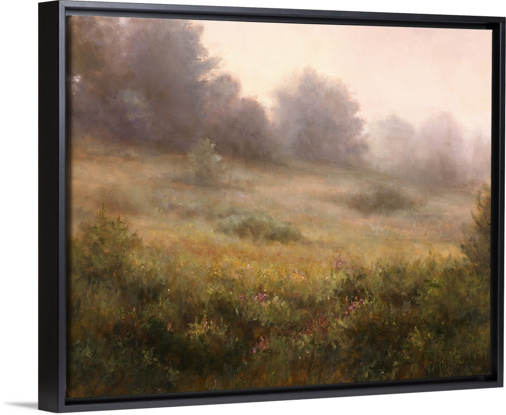 <p>Contemporary painting of an idyllic countryside shrouded in a light haze.</p>