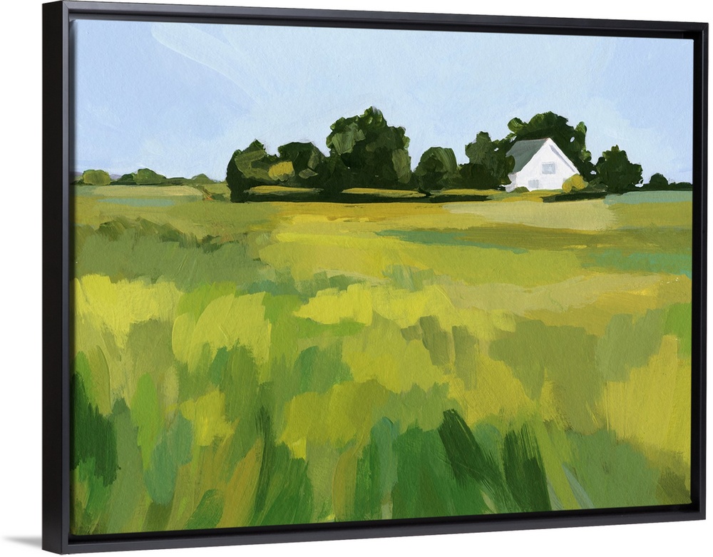 <p>A simple contemporary painting of a field of tall grasses with a white house in the distance. The brushstrokes are thick and almost abstract.</p>