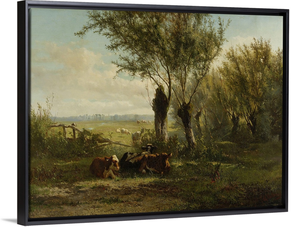<p>Meadow near Oosterbeek, by Gerard Bilders, 1860 Dutch painting, oil on canvas. Cow in foreground resting near pruned trees, with others grazing in the distance.</p>