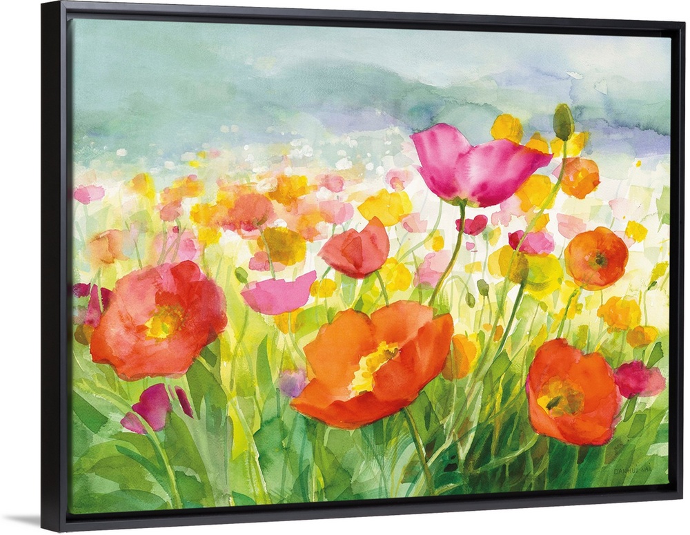 <p>Vibrant orange, pink, and yellow watercolor poppy flowers in a field.</p>
