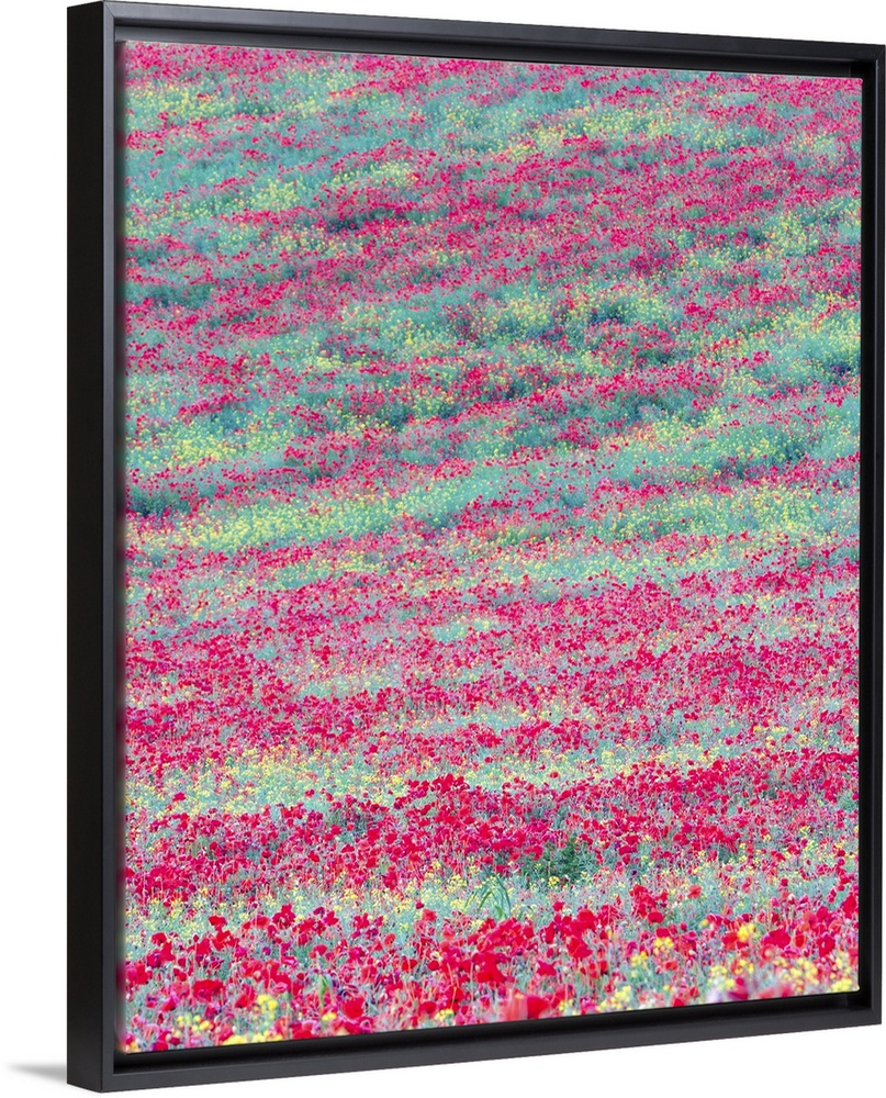 <p>An abstracted tapestry of reds, oranges greens and yellows formed of flowers across a hillside meadow.</p>