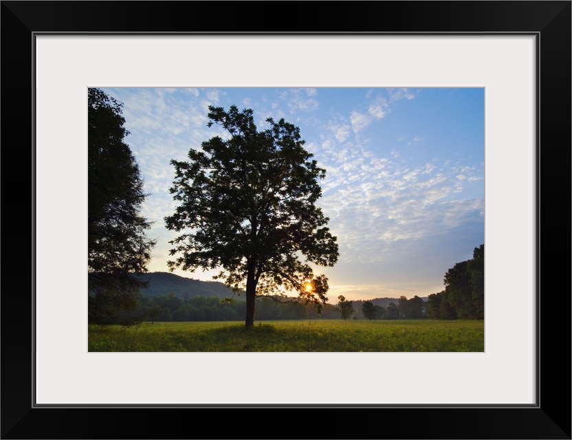 <p>Landscape photograph on a big wall hanging of the silhouette of a tree in the foreground of an open meadow in Cades Cove, at sunset. Mountains in the distance at the Great Smoky Mountains National Park in Tennessee.</p>