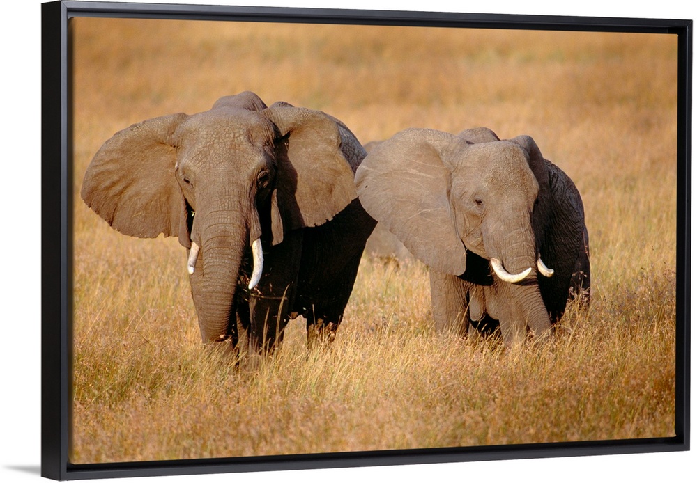 <p>Two large African elephants are photographed in a tall grassy field.</p>
