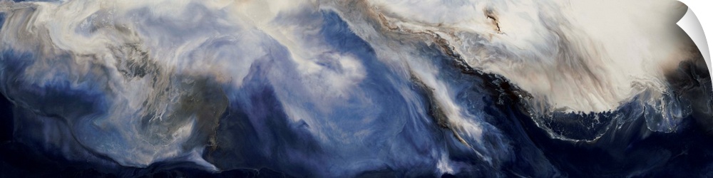 <p>Panoramic abstract painting with deep blue hues forming together with brown and white hues to create a marbled look.</p>