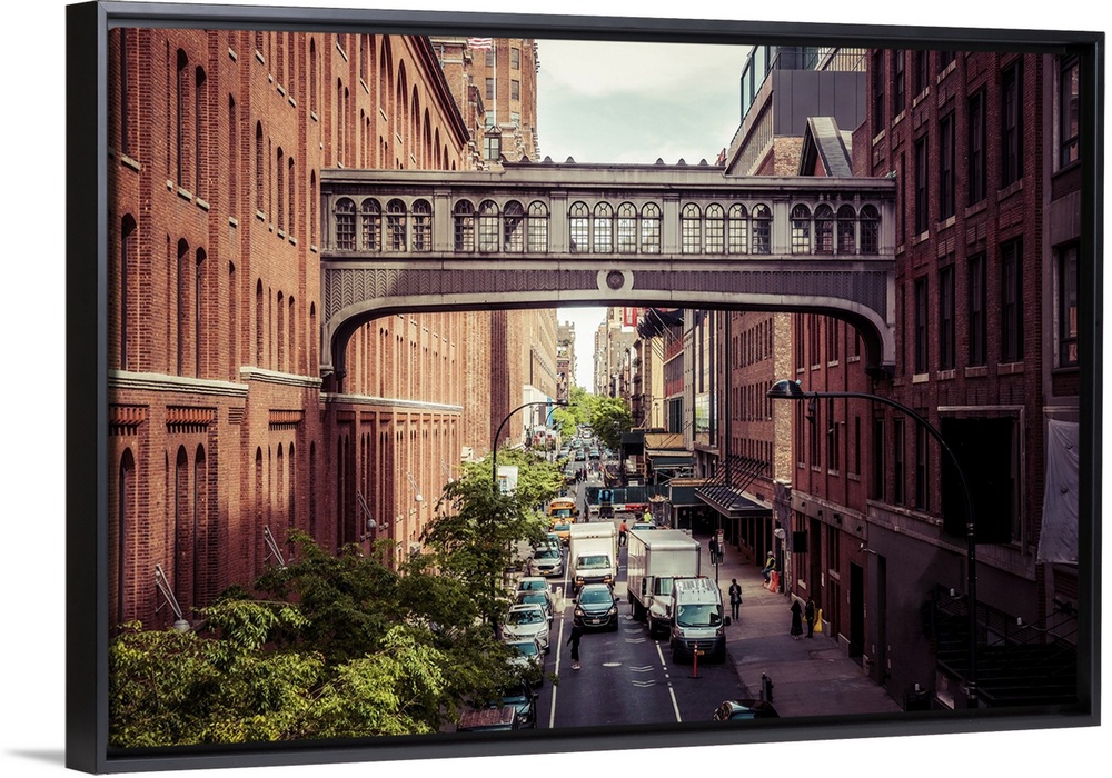 <p>A photograph showing a covered connector between two buildings in New York City with busy trucks underneath</p>
