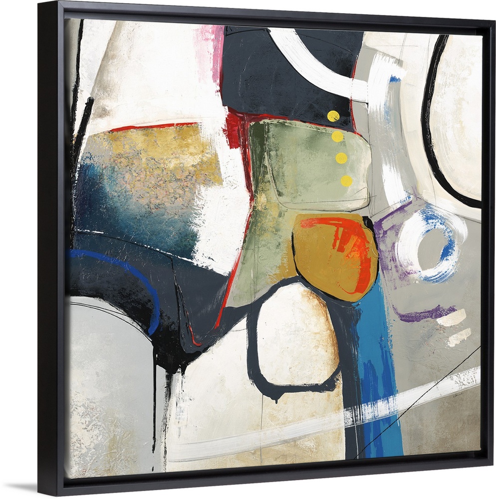 <p>Square abstract art created with shapes in various colors coming together in the center with a gray, white, and brown toned background.</p>