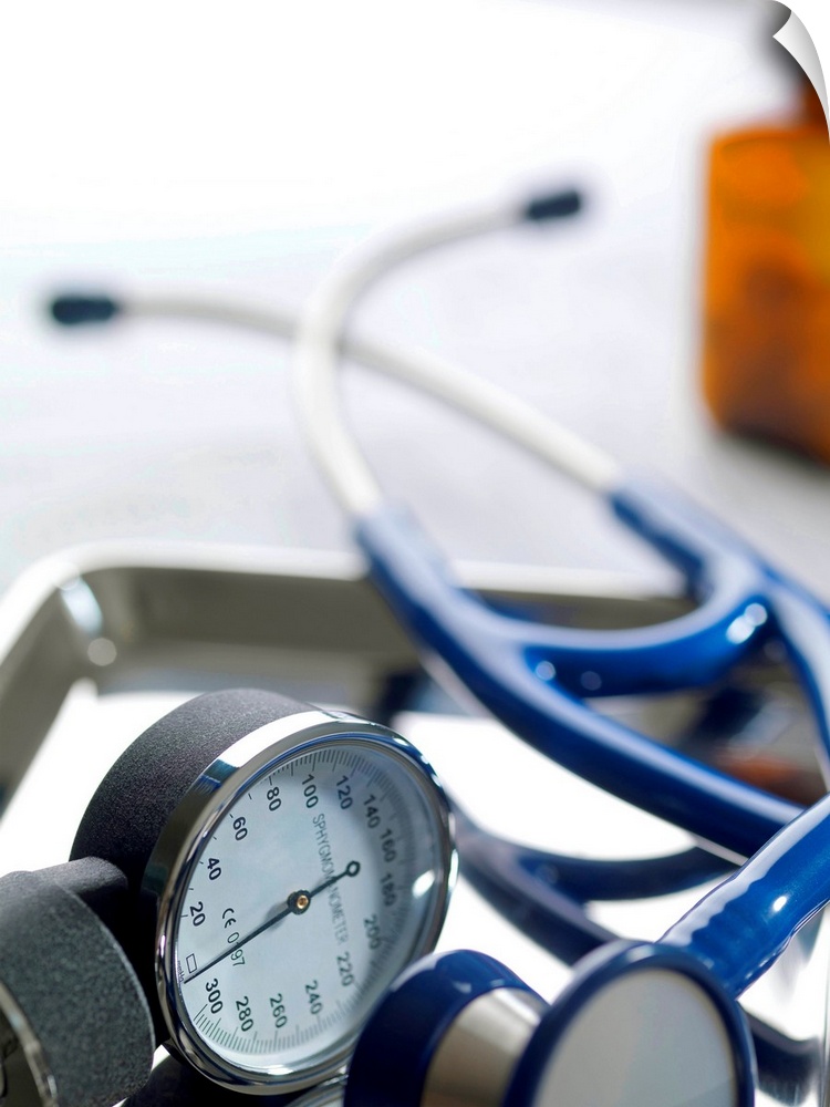<p>Medical equipment. Sphygmomanometer (left) and stethoscope (right) on a metal tray.</p>