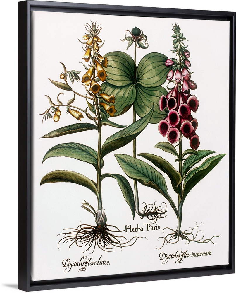 <p>Medicinal plants. Historical artwork of foxglove plants (Digitalis sp., left and right) and herb paris (Paris quadrifolia, centre). Both plants are extremely toxic, but can be used in medicinal treatments. Tincture of herb paris is an arsenic antidote and the juice of the berries can cure eye inflammations. The leaves of the foxglove contain digitalin, which is a heart muscle stimulant. High doses cause disorganised pumping of the heart. However, small quantities can be used as a drug to treat heart failure, for example in cases of heart attack (myocardial infarction). From Hortus Eystettensis, by Basilius Besler, published in 1613.</p>