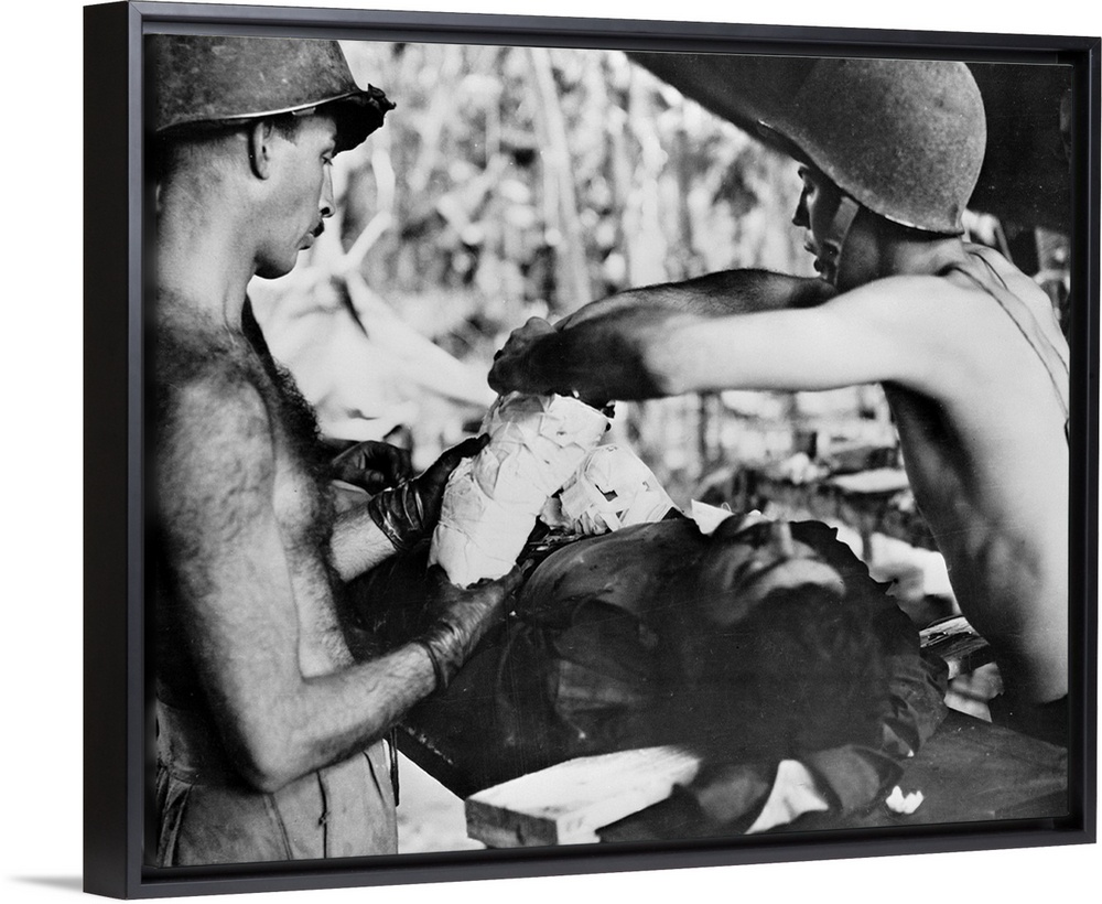 <p>Medics operating on a wounded American soldier in New Guinea. Photograph, c1943.</p>
