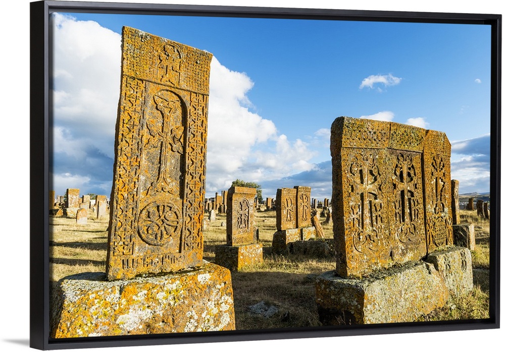 <p>Medieval Khachkars carved memorial stele, Noratus cemetery, Sevan Lake, Gegharkunik province, Armenia, Caucasus, Asia</p>