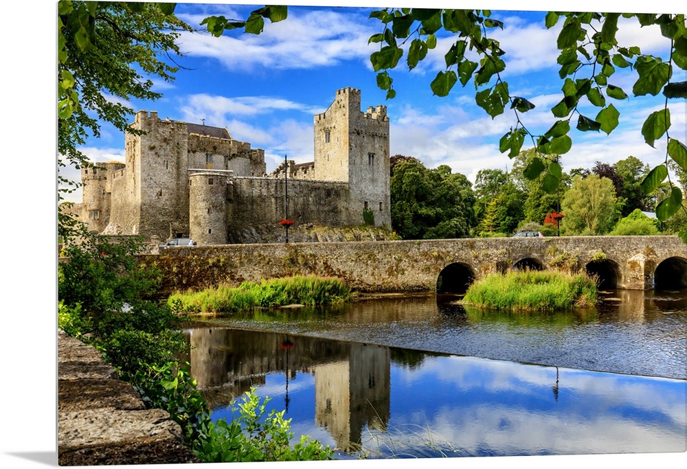 <p>Europe, Ireland, Caher, Tipperary, medieval town of Caher with fortress and bridge reflecting in the river</p>