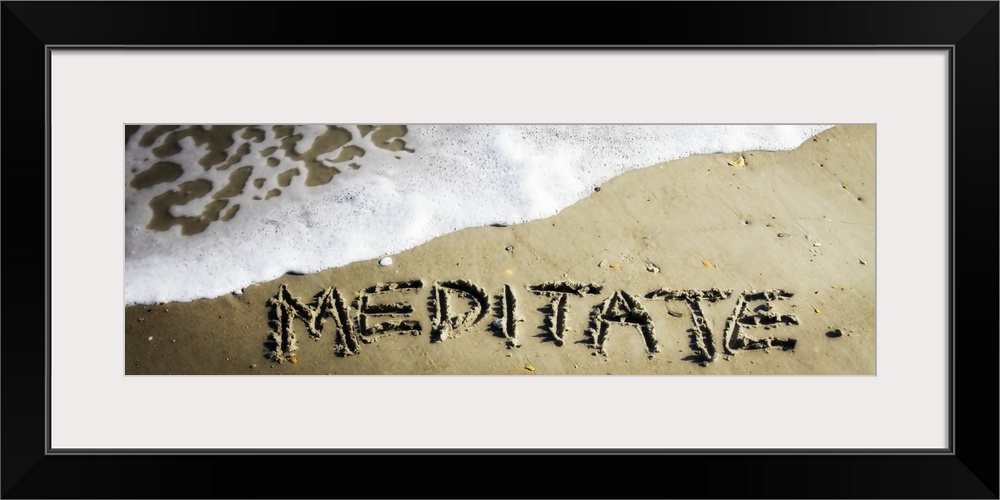 <p>The word "Meditate" drawn in the wet sand near ocean water.</p>