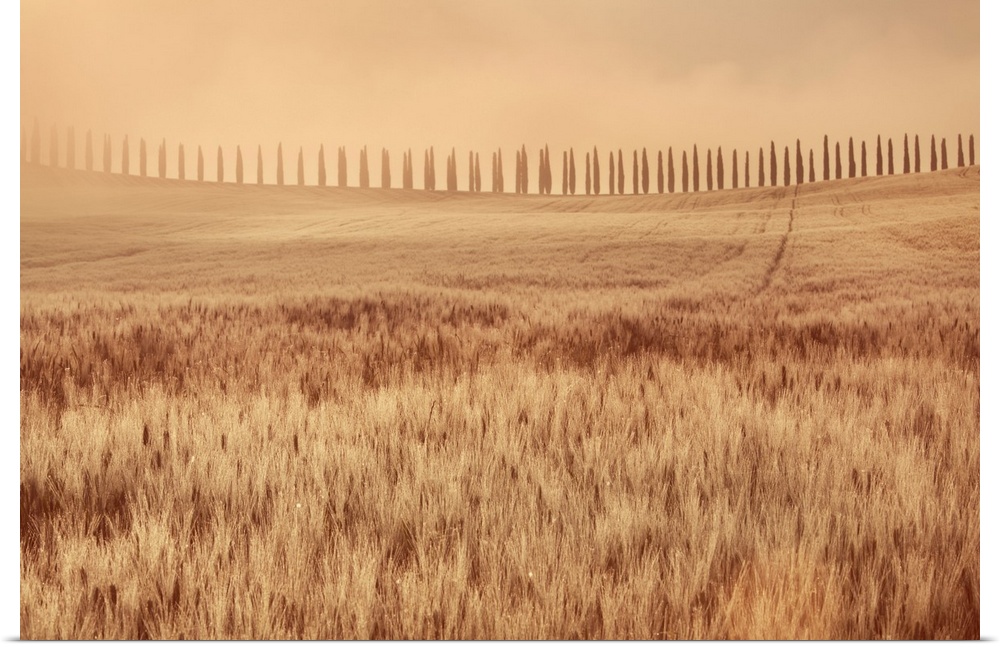 <p>Mediterranean cypress alley in fog. Italy, Tuscany, Siena, Val d'Orcia, San Quirico d'Orcia, south of. Tuscany, Western Europe, Italy.</p>