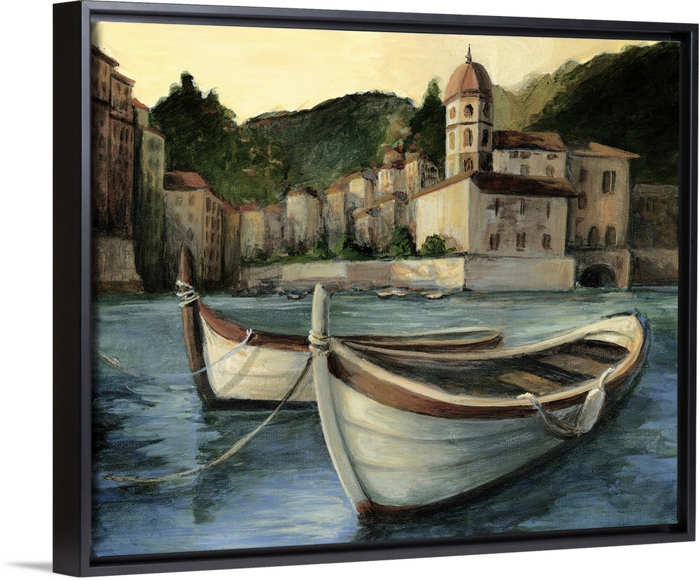 <p>Contemporary painting of a coastal village with rowboats in the foreground.</p>