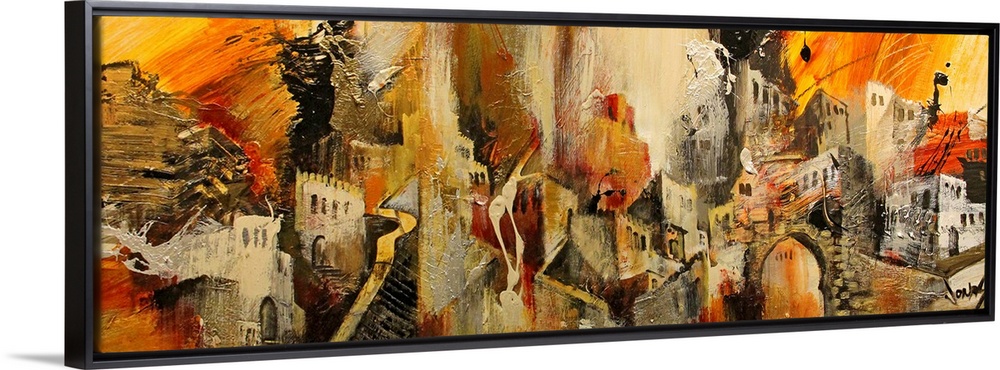 <p>Horizontal, abstract painting on a large wall hanging of a variety of Mediterranean buildings and structures, collaged together using thick, heavy brushstrokes.</p>