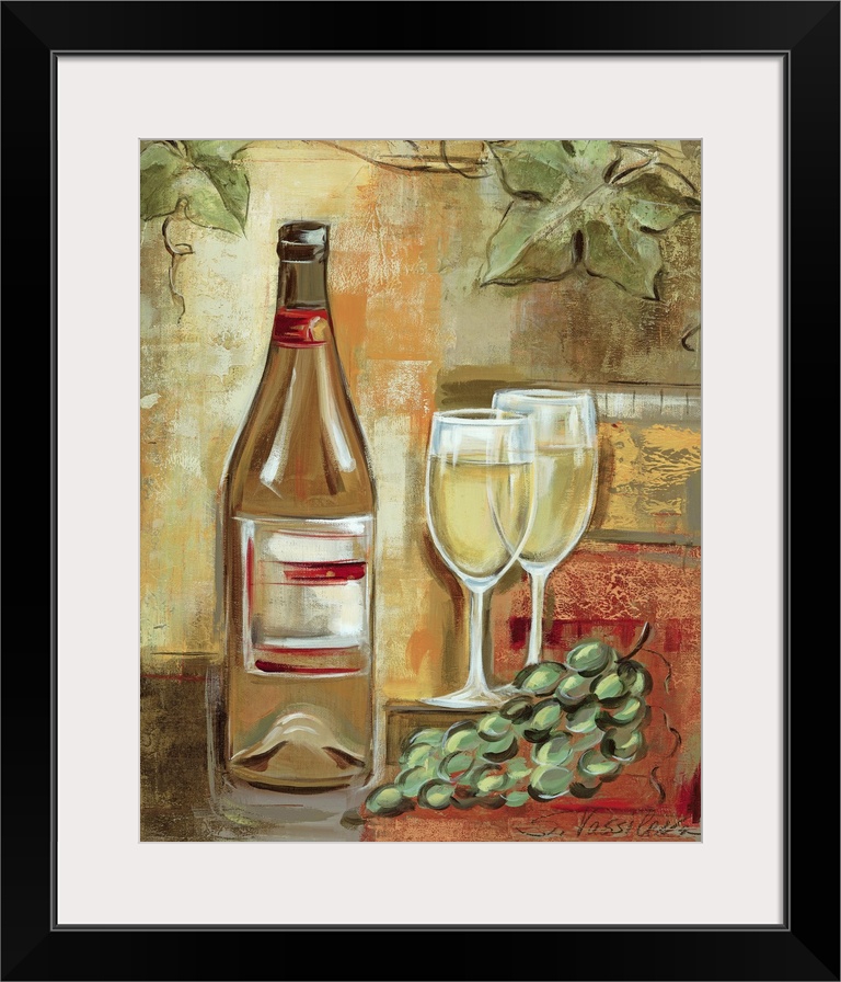 <p>Oversized vertical painting of a wine bottle next to two glasses of white wine and a bunch of grapes, on a background od multicolored patches and a vine and two large leaves at the top.</p>
