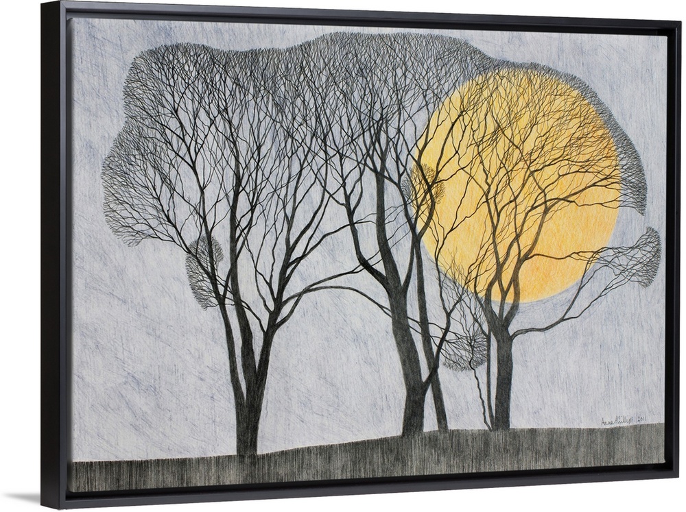 <p>Fine-tip drawing of bare branch trees enveloping a giant moon.</p>
