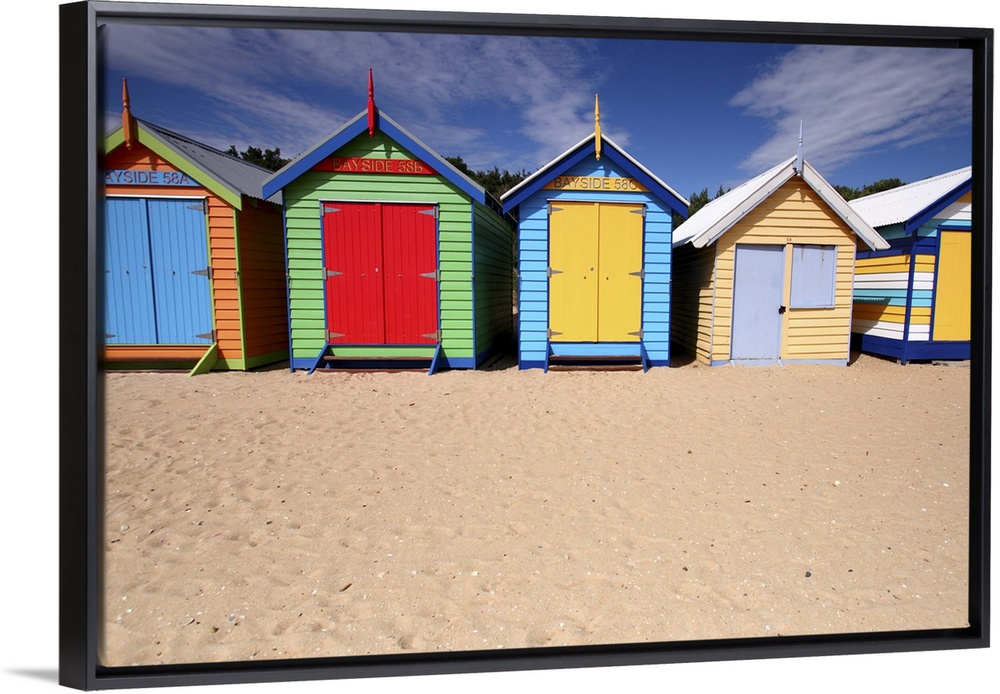 <p>Photograph of colorful shacks on the beach under a cloudy sky.</p>