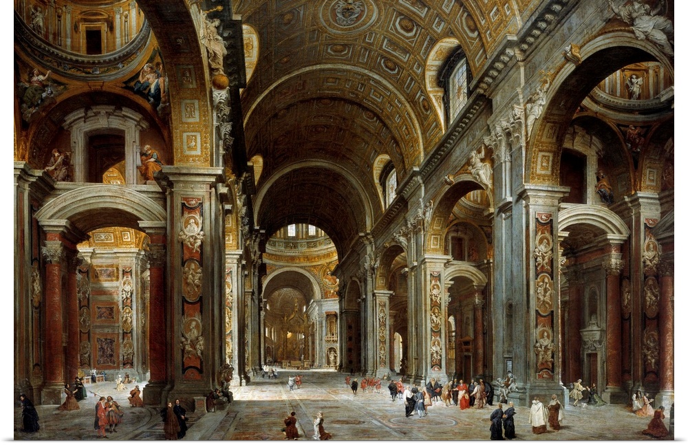<p>The prelate, diplomat and poet Melchior de Polignac (1661-1741) visiting St. Peter's Basilica in Rome. Painting by Giovanni Paolo Pannini (Panini ) (1691-1765), 1730. 1,5 x 2,25 m. Louvre Museum, Paris</p>