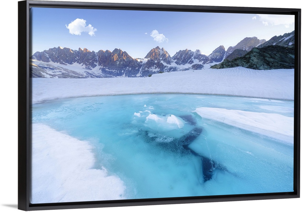 <p>Melting ice on surface of Forbici Lake during spring thaw, Valmalenco, Valtellina, Sondrio province, Lombardy, Italy, Europe</p>