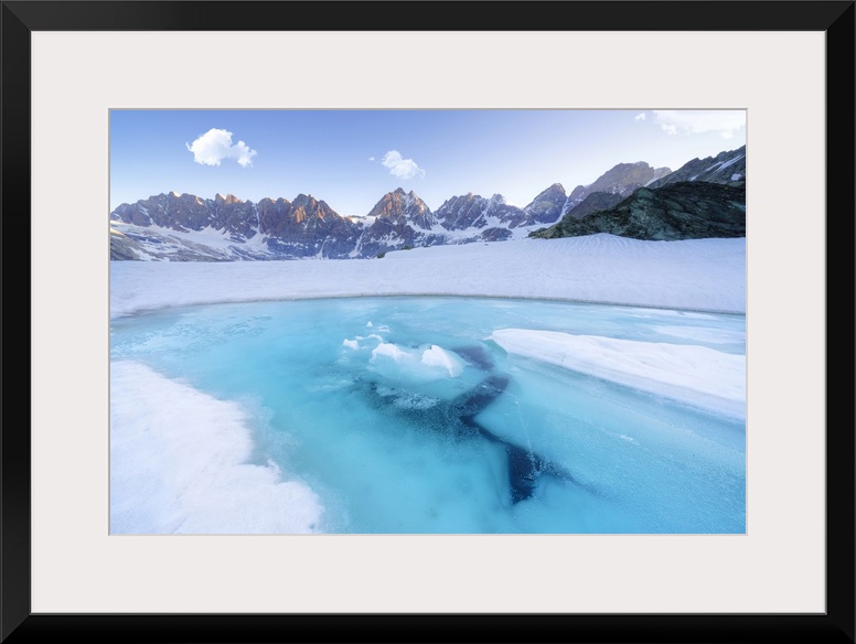 <p>Melting ice on surface of Forbici Lake during spring thaw, Valmalenco, Valtellina, Sondrio province, Lombardy, Italy, Europe</p>
