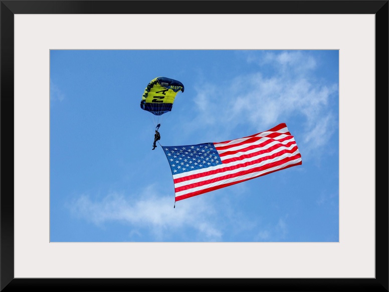 <p>Member of the U.S. Navy Parachute Team flies the American Flag.</p>
