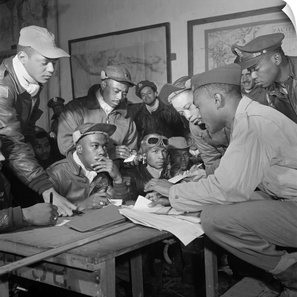 <p>Members of the Tuskegee Airmen in a meeting at Ramitelli, Italy. Front row seated, left to right: unidentified; Jimmie Wheeler (with goggles); Emile Clifton (cloth cap). Standing, left to right: Ronald Reeves; Hiram Mann; Joseph Chineworth; Elwood Driver; Edward Thomas; Woodrow Crockett. Photograph by Toni Frissell, March 1945.</p>