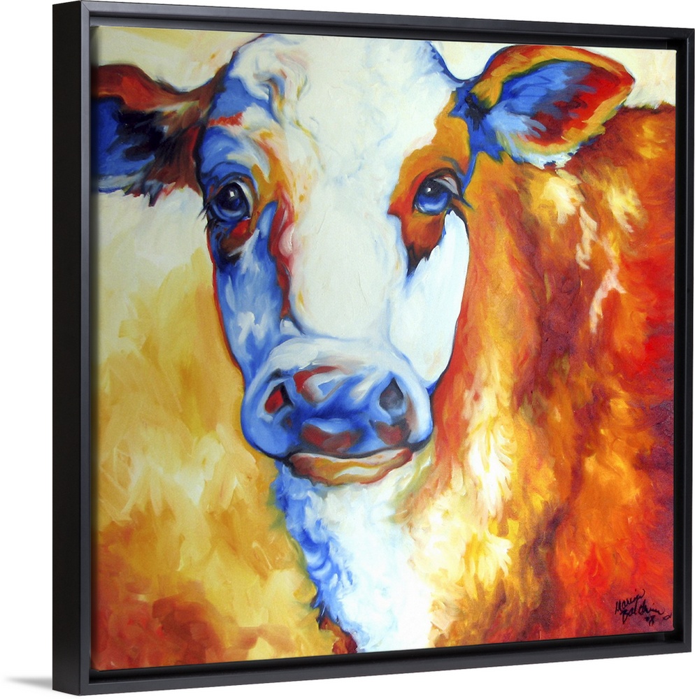 <p>Contemporary painting of a cow made with orange, yellow, red, white, and blue hues on a square background.</p>
