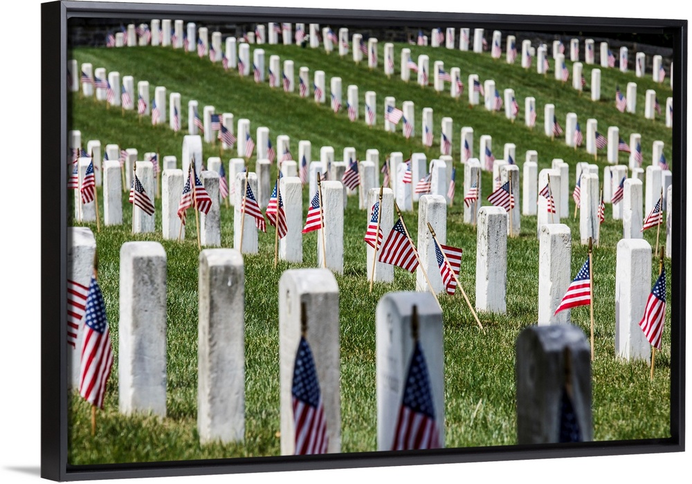 <p>America flags stand in front of rows of white uniform gravestones at the well maintained grassy Annapolis veteran's cemetery in Maryland, united states on memorial and veteran's day. Soldiers from the civil war and WWII buried here.</p>