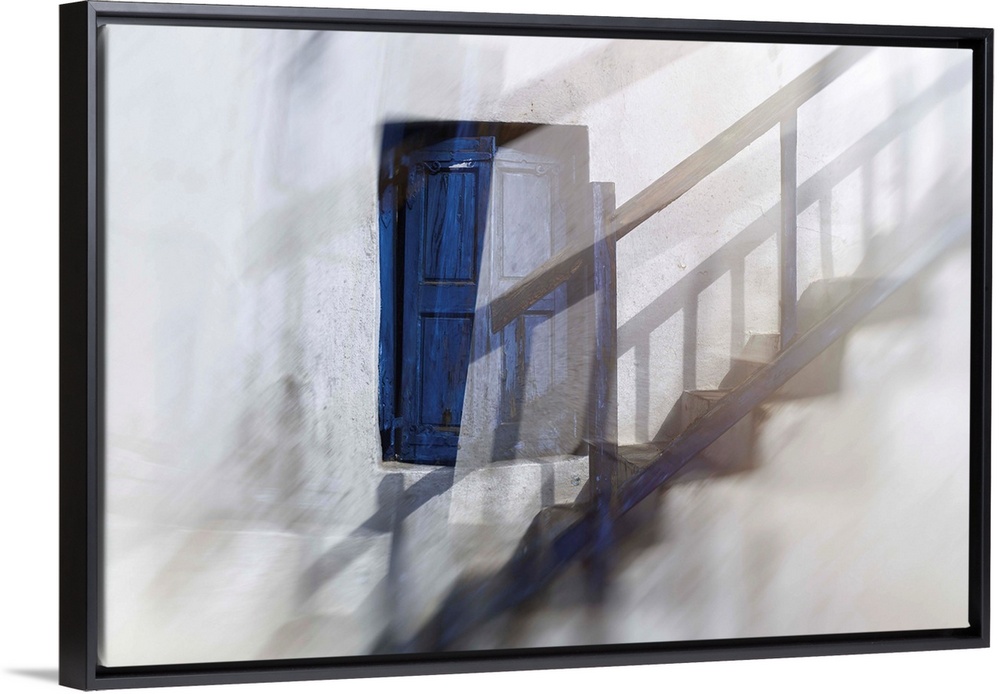 <p>Ghostly image of a blue shuttered window along a set up steps with the shadow of the railings running up the wall.</p>