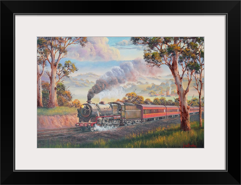 <p>Contemporary painting of a train passing through a countryside landscape.</p>