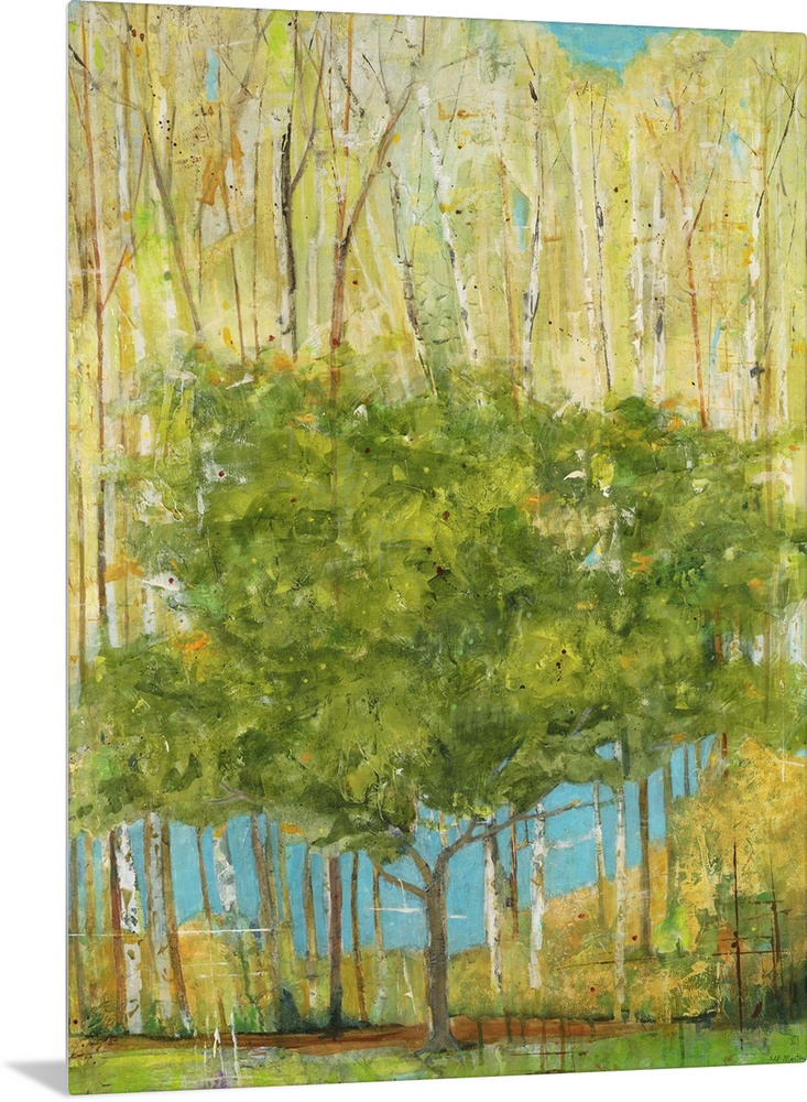 <p>Contemporary painting of a single green tree dwarfed by taller trees with pale foliage.</p>