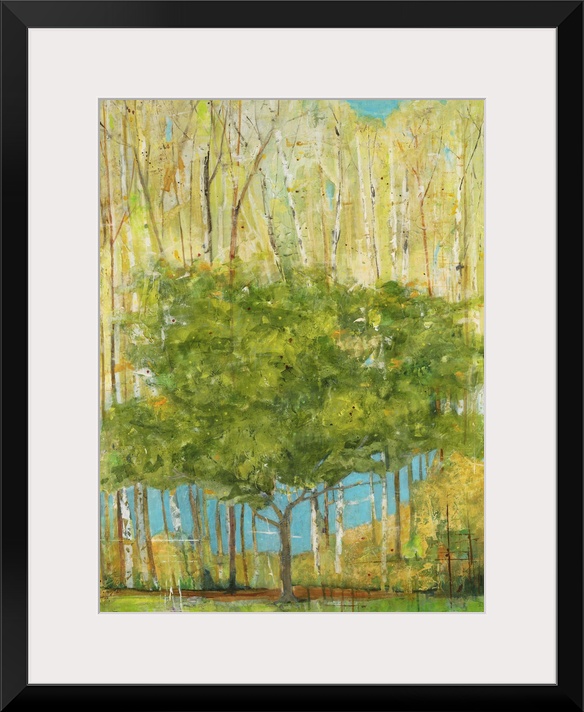 <p>Contemporary painting of a single green tree dwarfed by taller trees with pale foliage.</p>
