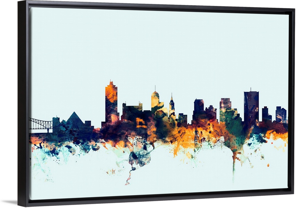 <p>Dark watercolor silhouette of the Memphis city skyline against a light blue background.</p>