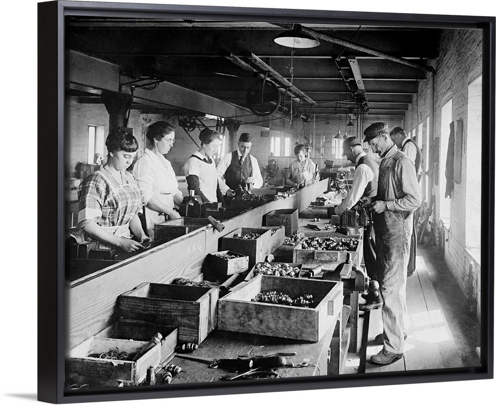 <p>Men and Women working on an assembly line in the Express Spark Plug Co. Ca. 1920, in the Washington, D.C. area.</p>