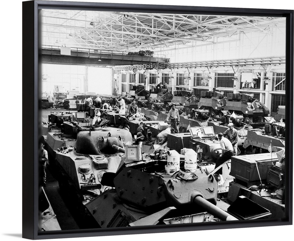 <p>Men and women working on tanks at the Ford Motor Company plant in Richmond, California. Photograph, 1943.</p>