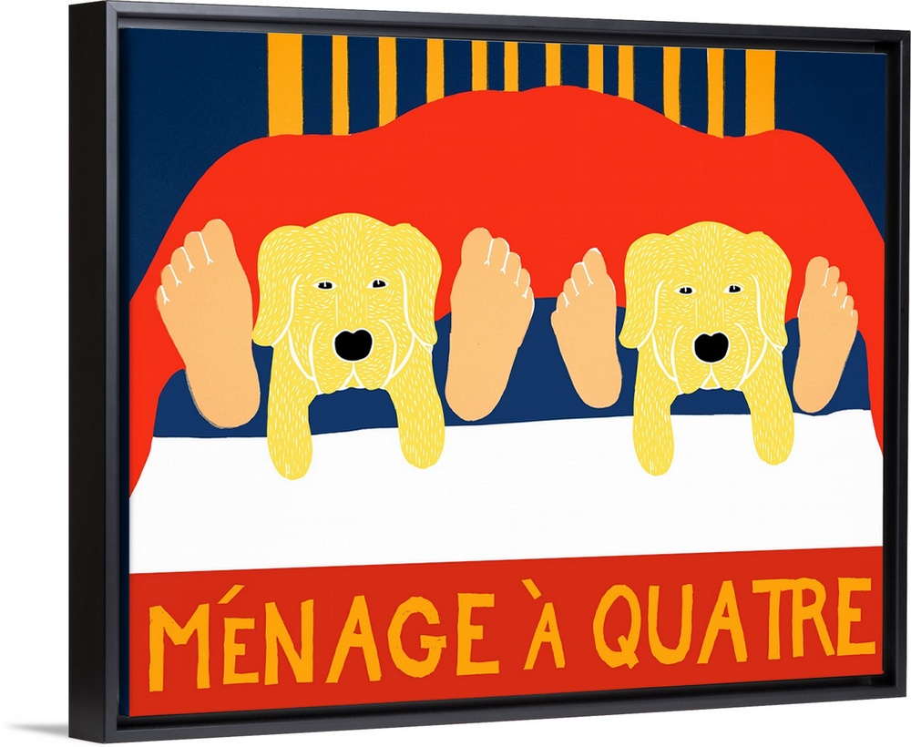 <p>Illustration of two yellow labs laying in between their owners legs at the foot of the bed with the phrase "Menage a Quatre" written on the bottom.</p>