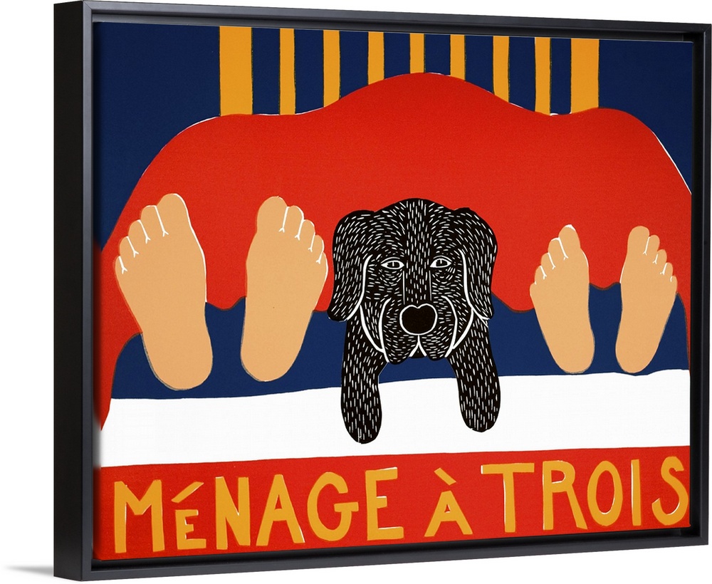 <p>Illustration of a black lab laying in the middle of its owners legs at the foot of the bed with the phrase "Menage a Trois" written at the bottom.</p>